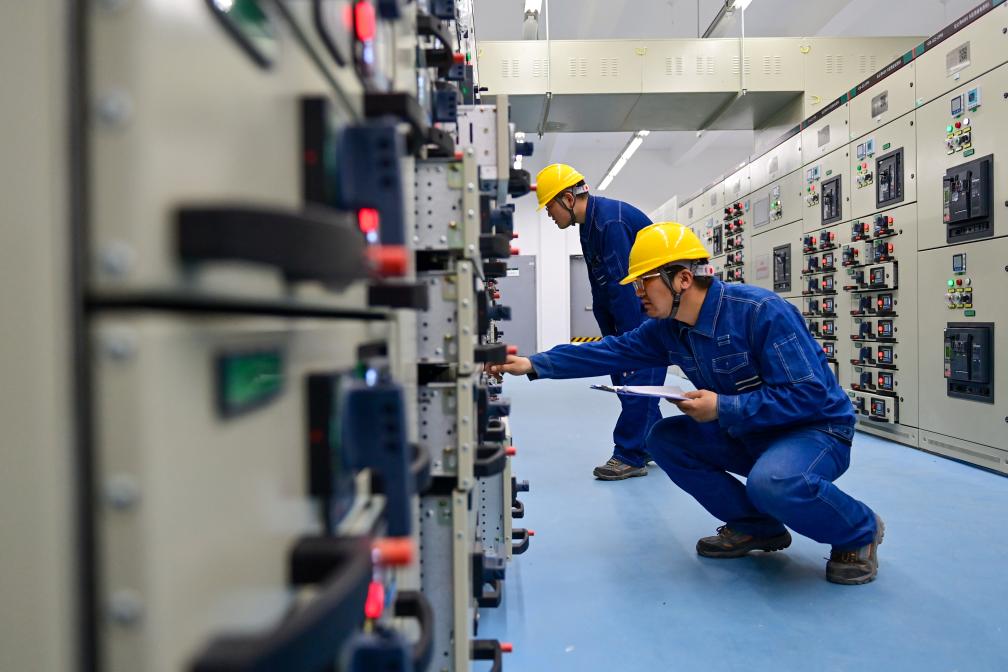 6月10日,在哈密—重庆±800千伏特高压直流输电工程新疆送端站——巴里坤换流站,运检人员在配电室进行巡检工作。新华社记者 丁磊 摄